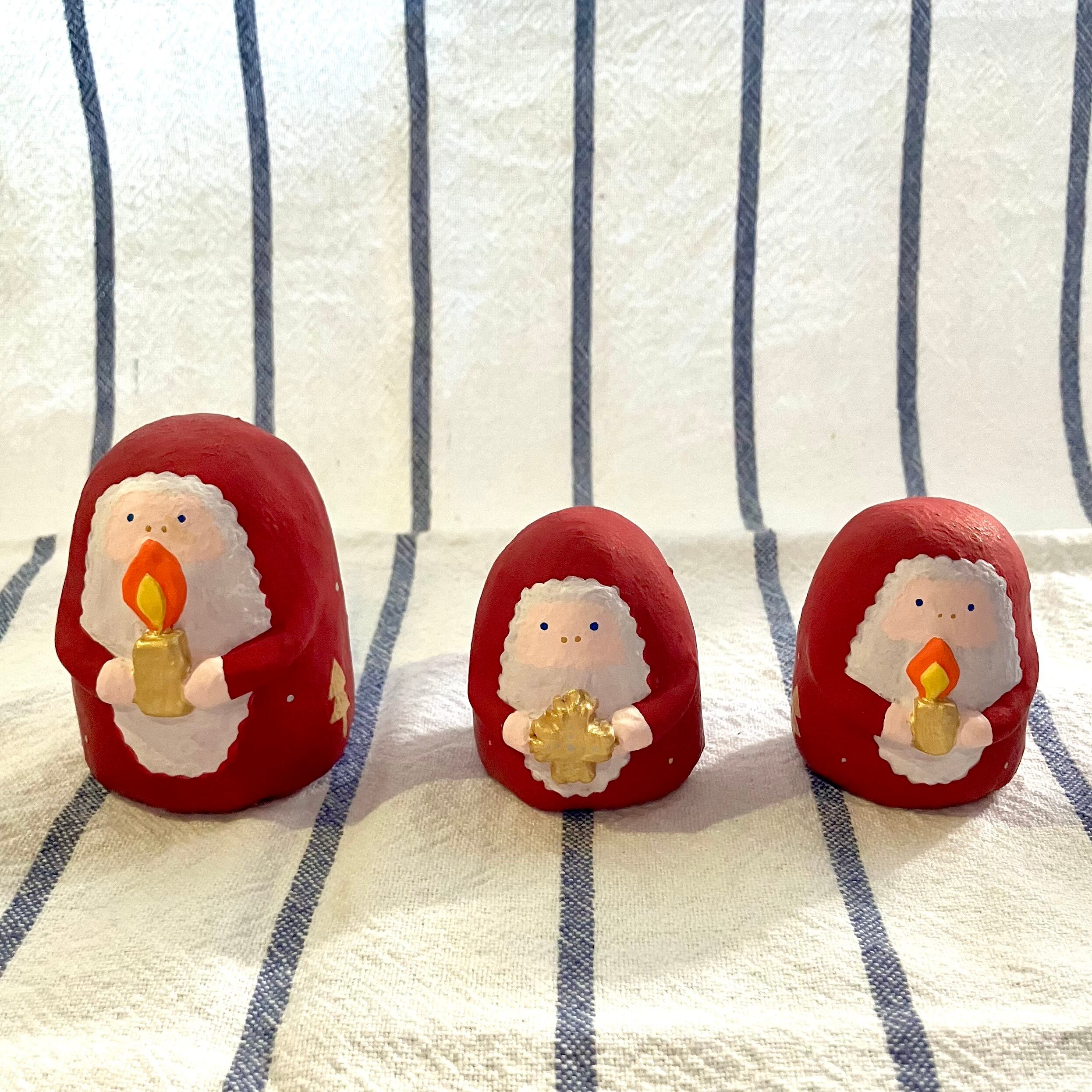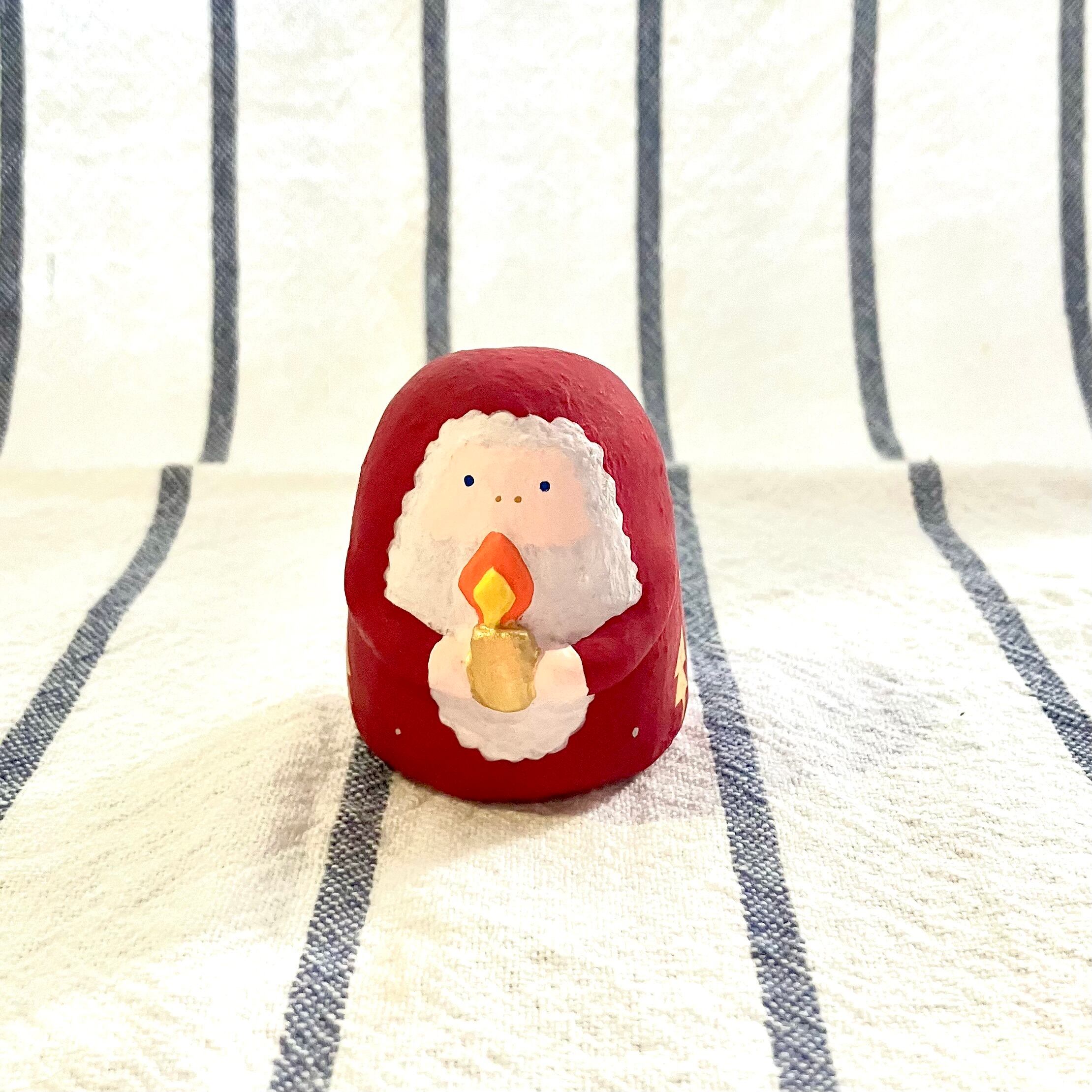 別バージョンで、十字架を持たせたレッドサンタさんも作っていますので、そちらもご覧下さると嬉しいです。手の平で優しく包める、手のひらサイズです。