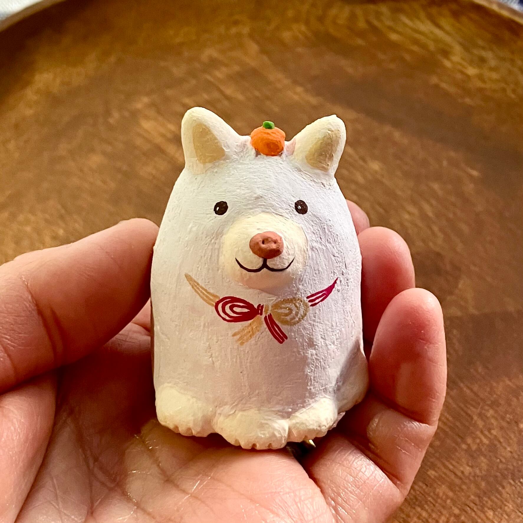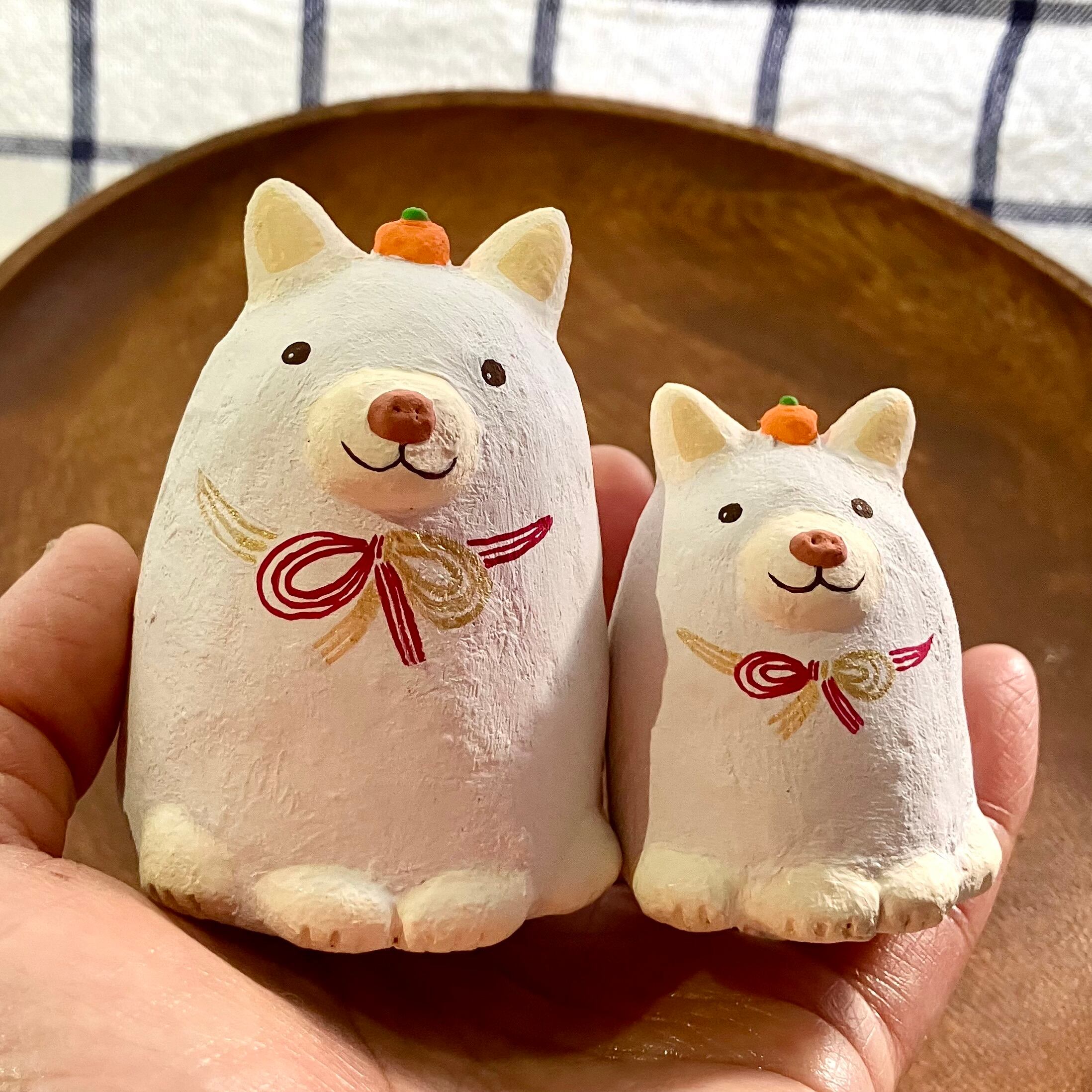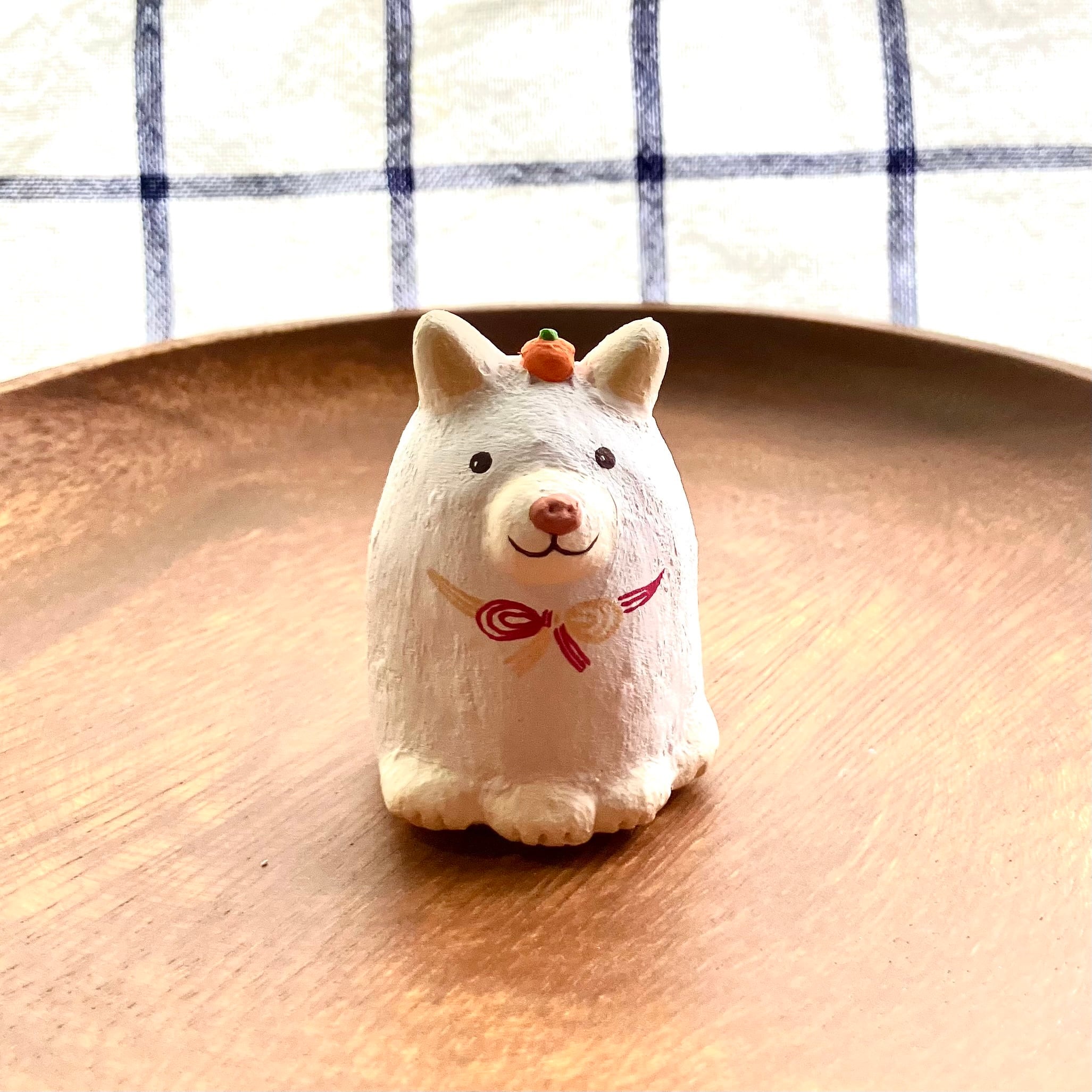 小サイズの干支の犬さん張り子です。お客様からのご意見を頂き製作致しました。少し珍しい白柴犬にしてみました。なんとなくもっちり鏡餅っぽいイメージが浮かんだので、頭にミカンを乗せ、リボンは紅白の水引き風におめでたい感じに仕上げています。