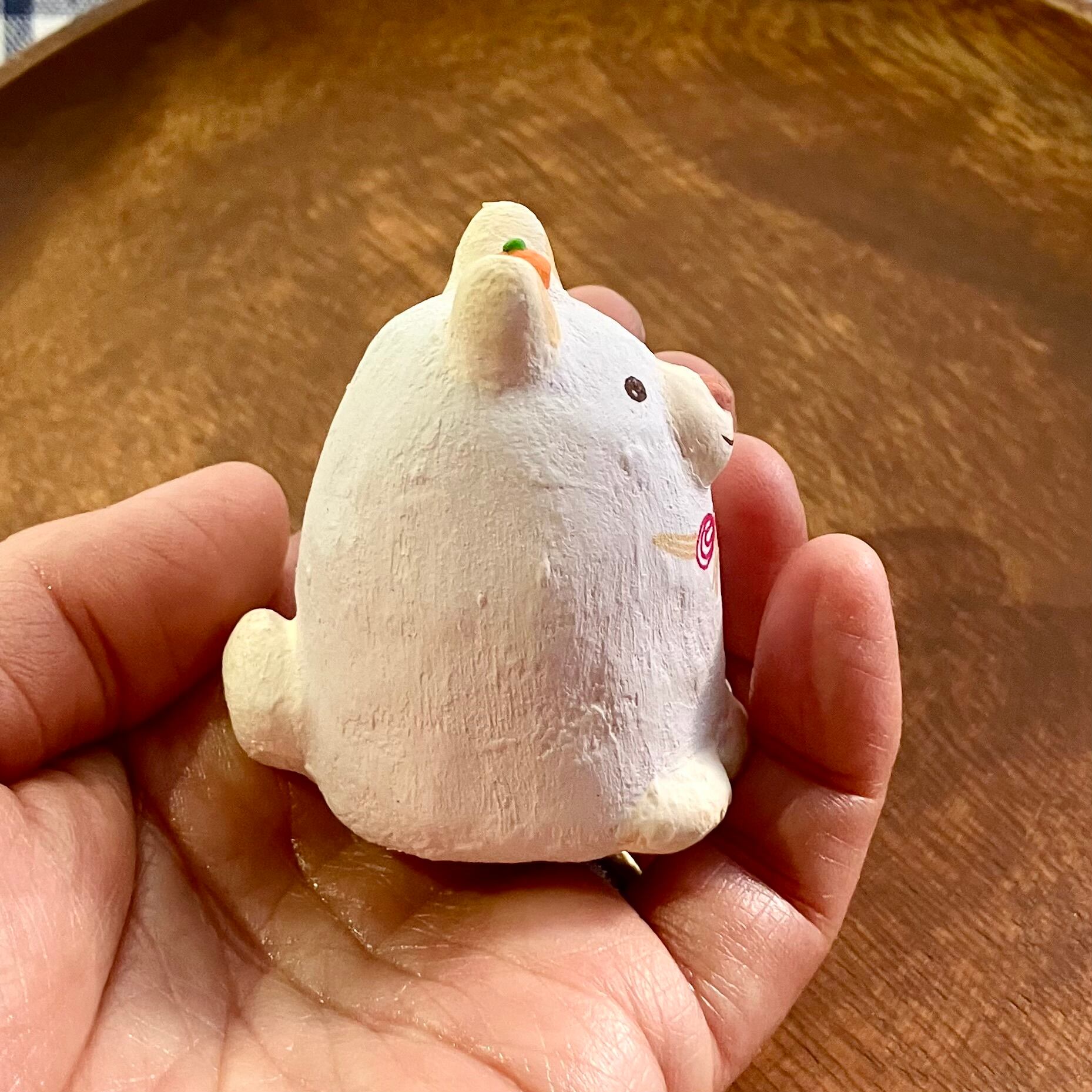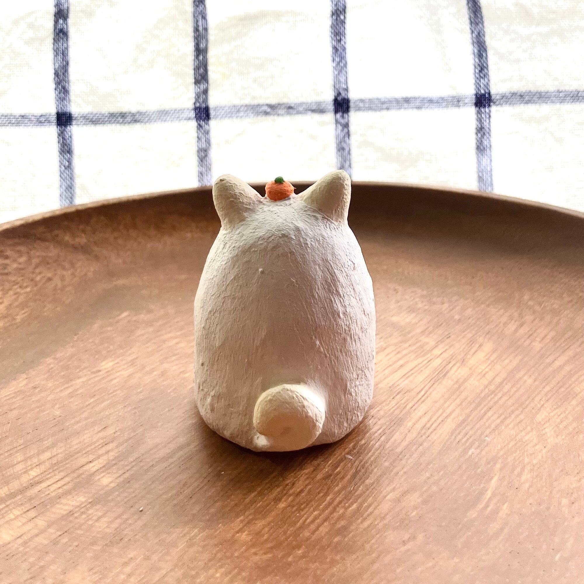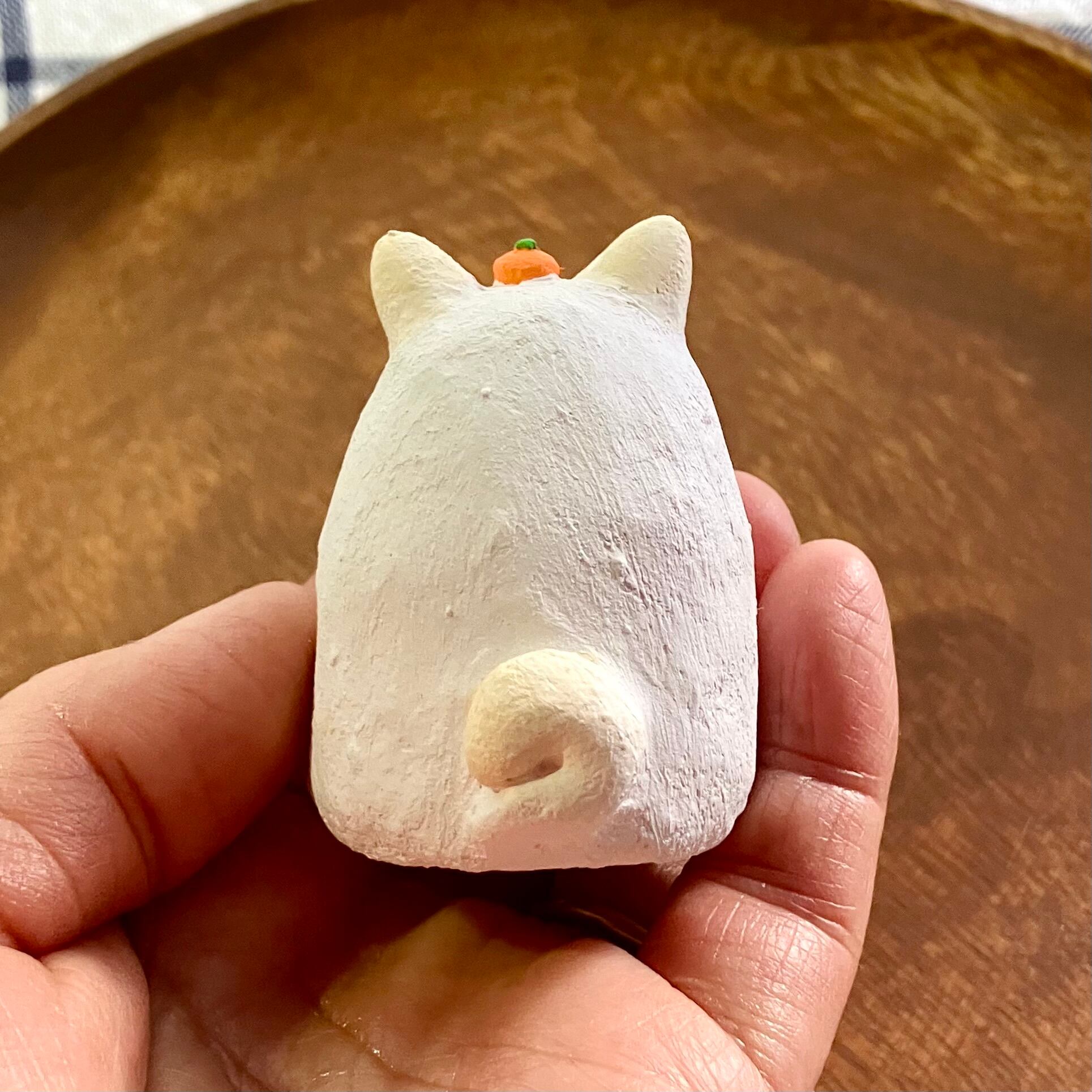 小サイズの干支の犬さん張り子です。お客様からのご意見を頂き製作致しました。少し珍しい白柴犬にしてみました。なんとなくもっちり鏡餅っぽいイメージが浮かんだので、頭にミカンを乗せ、リボンは紅白の水引き風におめでたい感じに仕上げています。