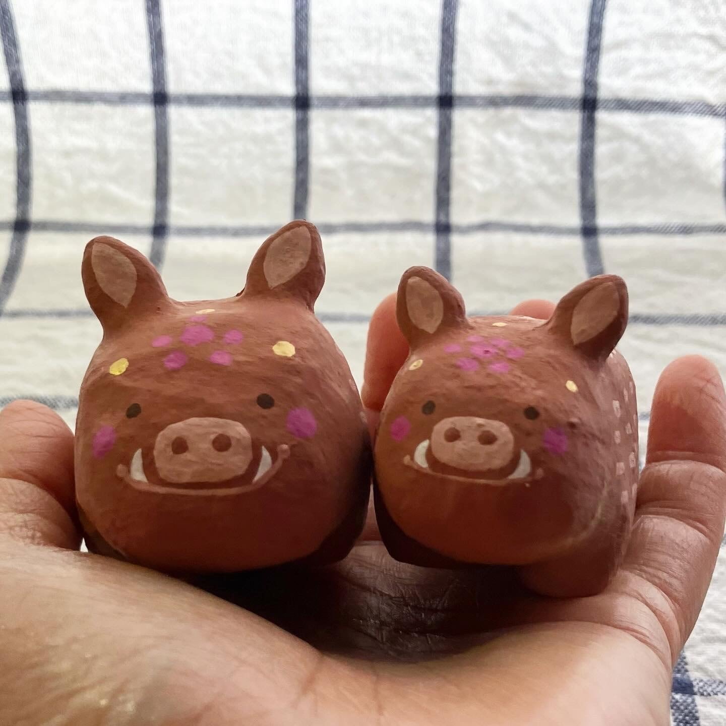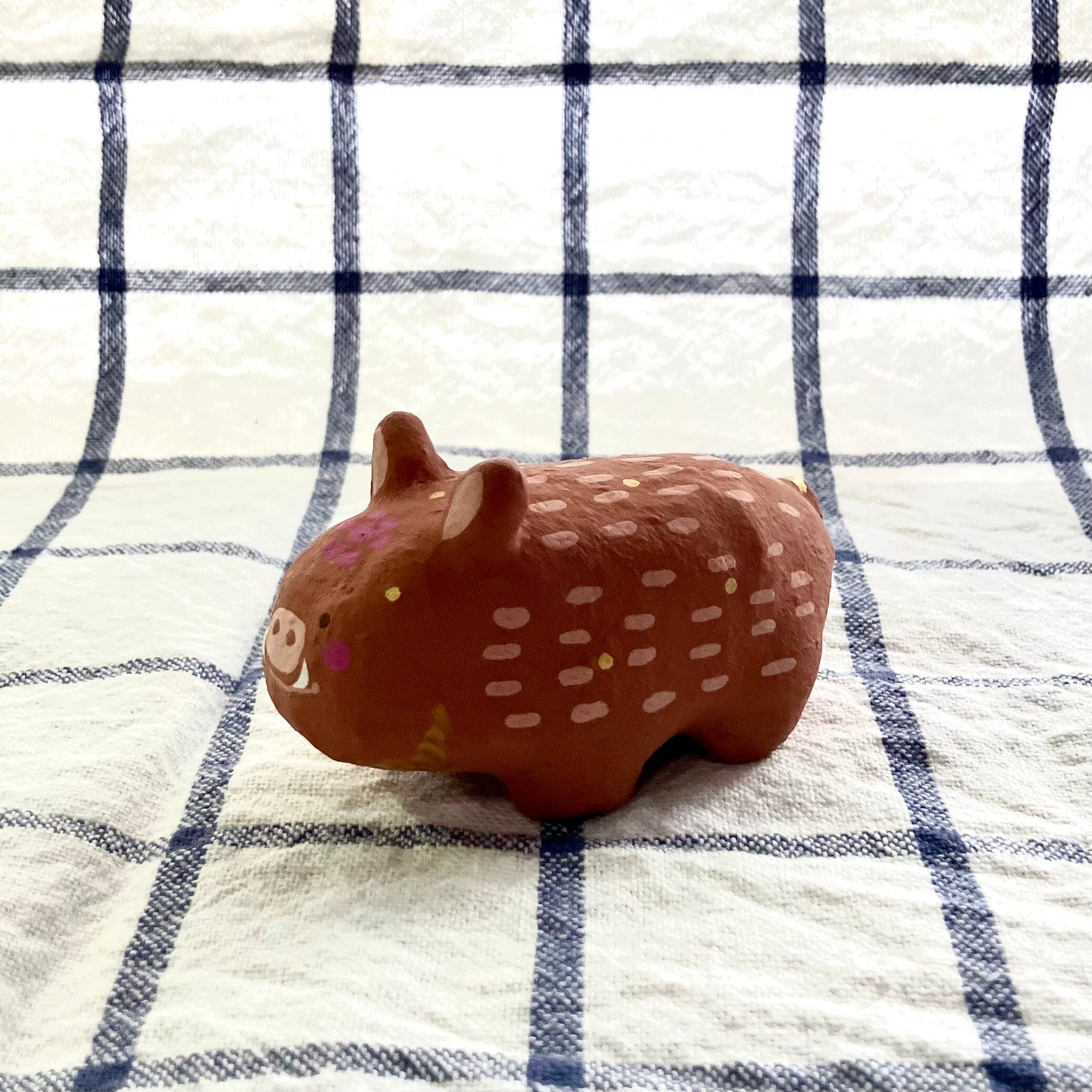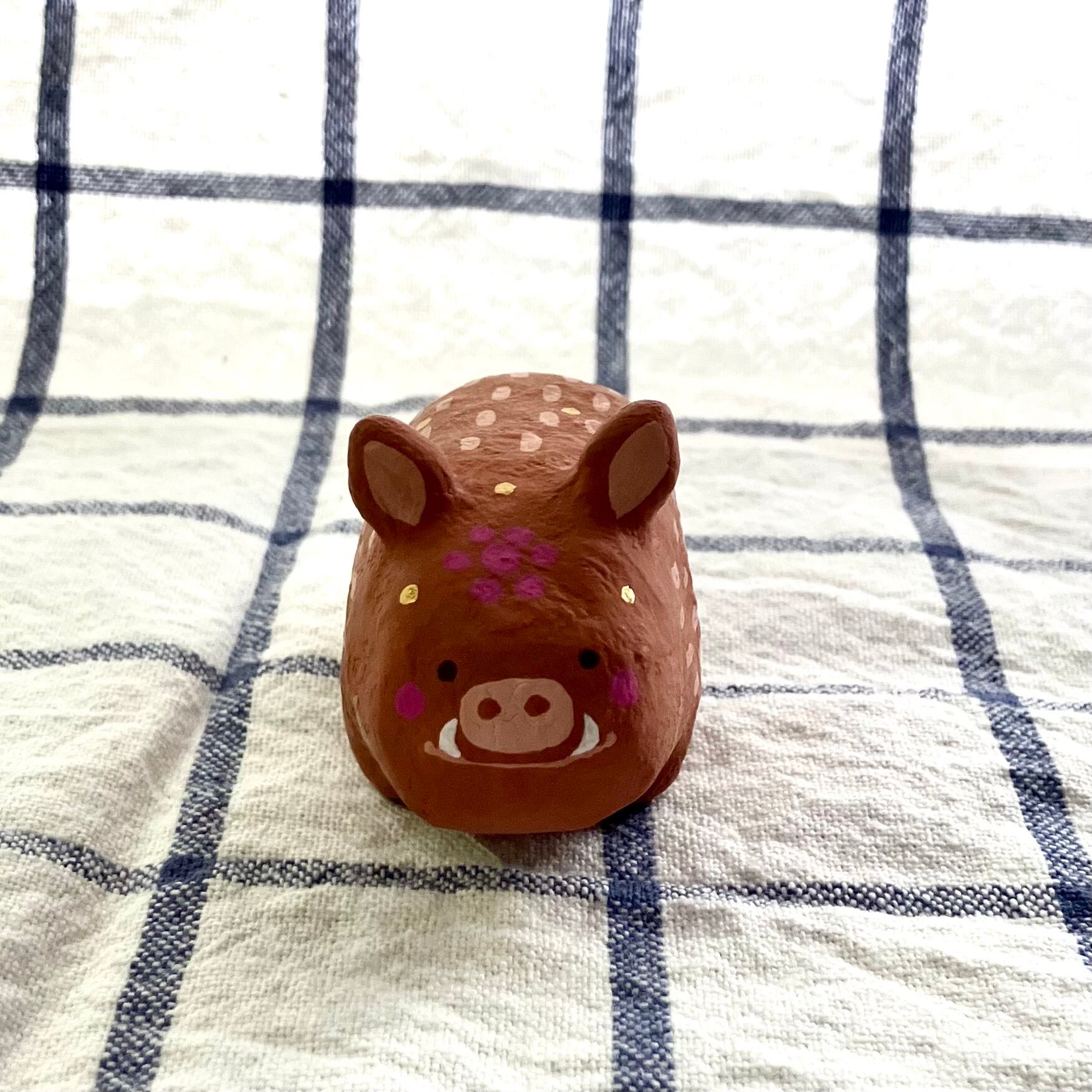 小サイズの干支のイノシシさん張り子です。お客様からのご意見を頂き製作致しました。おでこに梅の花をイメージしたピンクの模様とお顔と胴体所々にゴールドのドットを散りばめて、華やかな感じに仕上げています。