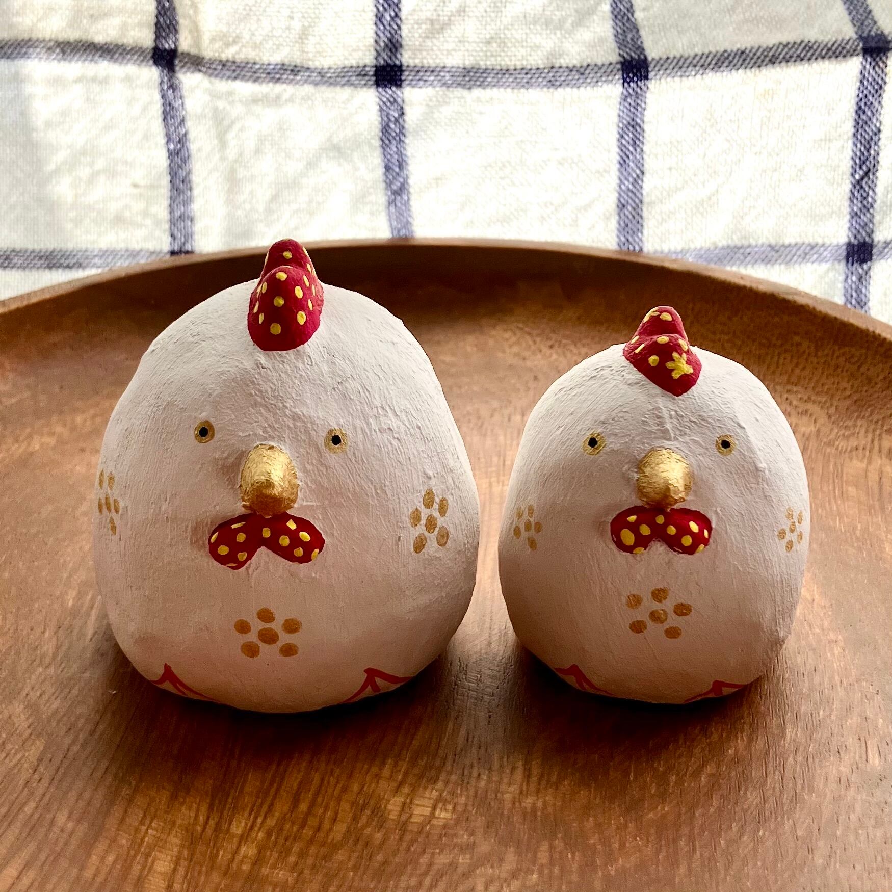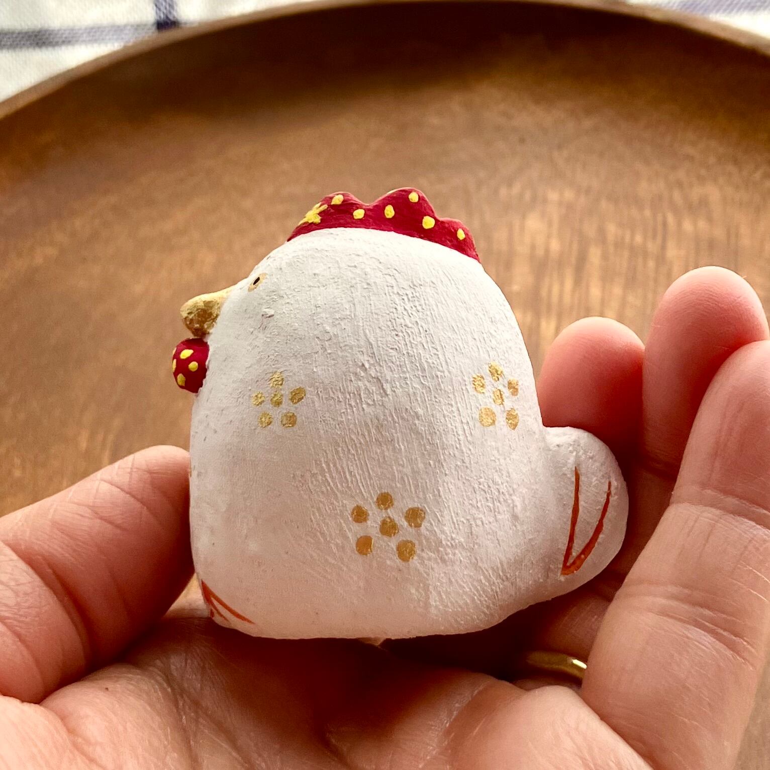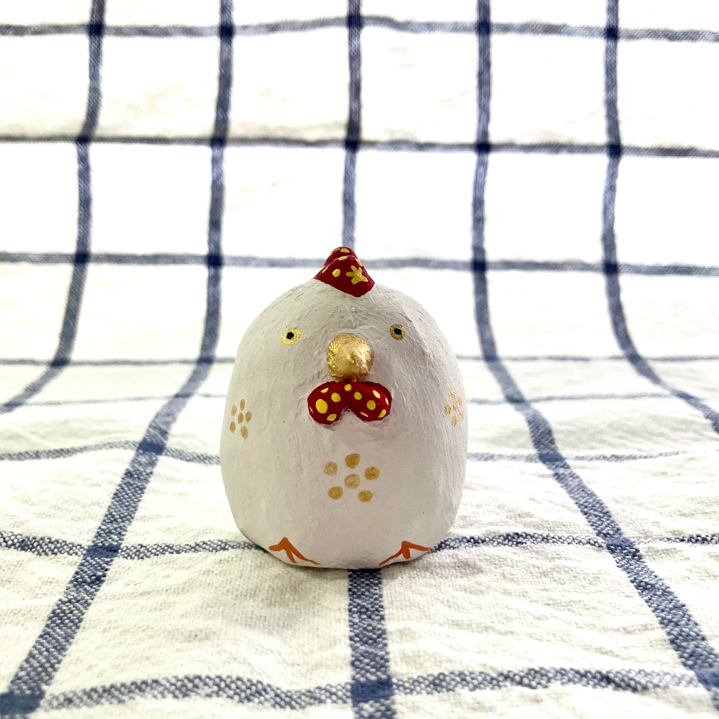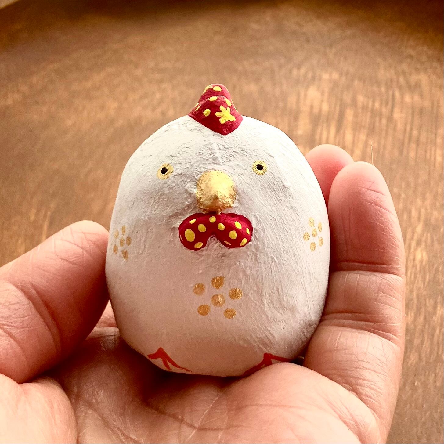 小サイズの干支の酉年のニワトリさん張り子です。お客様からのご意見を頂き製作致しました。クチバシと胴体所々にゴールドの梅の花の様なドットを散りばめて、華やかな感じに仕上げています。