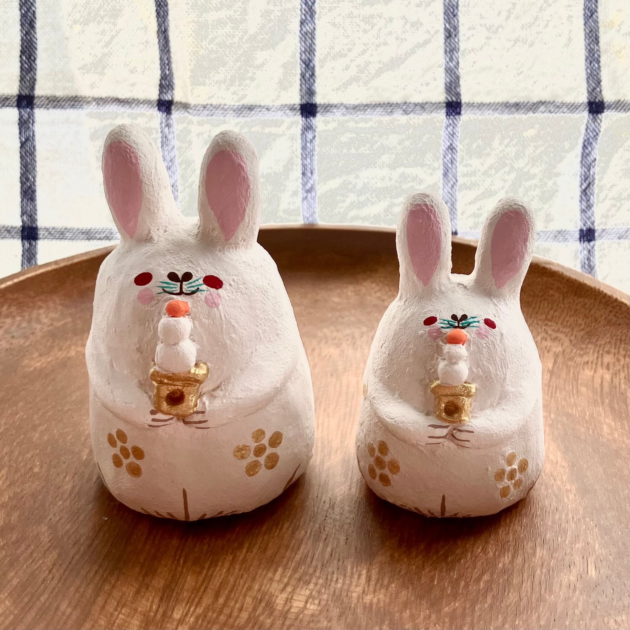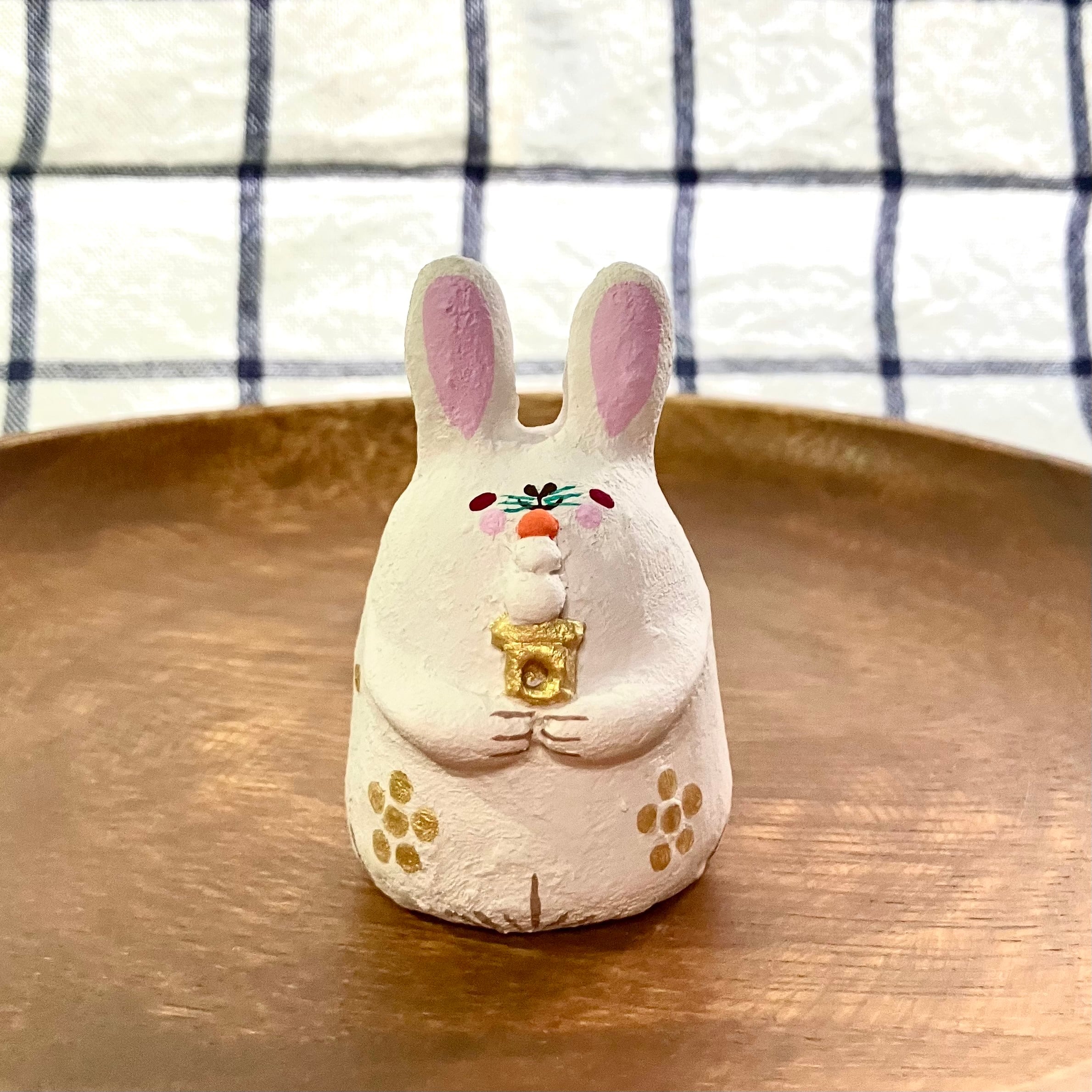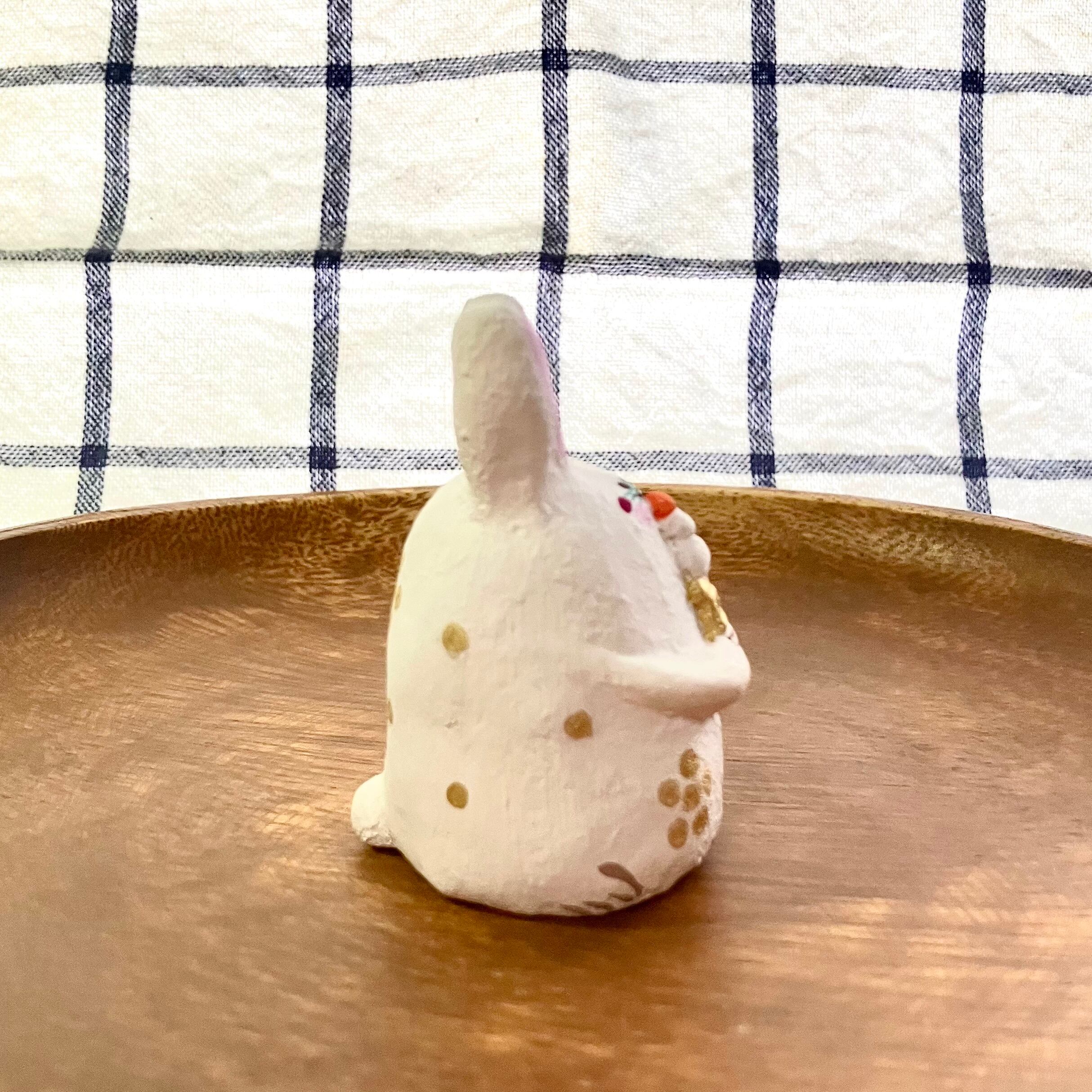 小サイズの干支の卯年の兎さん張り子です。こちらもお客様からのご意見を頂き製作致しましたが、卯年の兎さん張り子は以前も製作販売し、完売しておりました為、再販となりますがデザインは若干変えております。今回は立ち耳のみ製作しました。ゴールドの三宝に鏡餅を乗せた物を持たせてみました。所々にゴールドのドット、梅の花を思わせるドットをあしらって華やかに仕上げています。