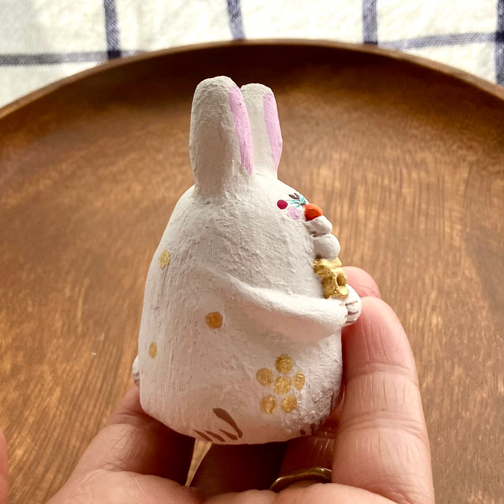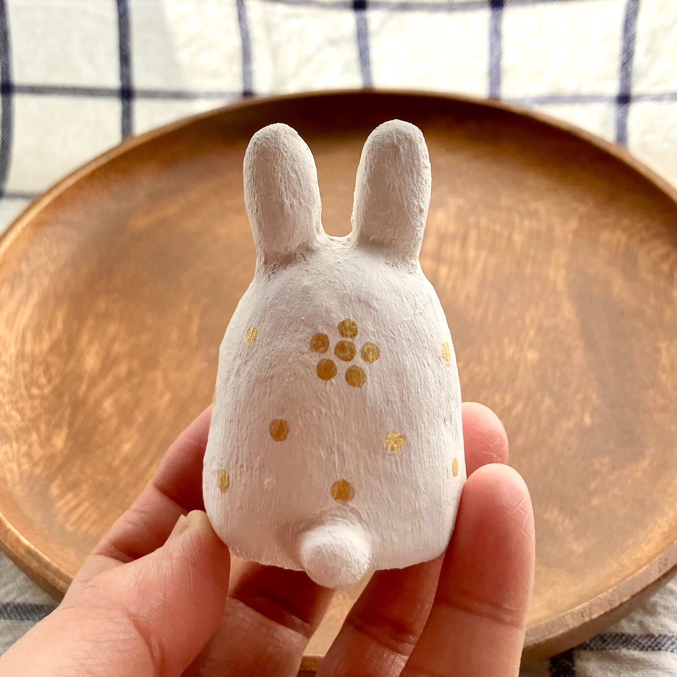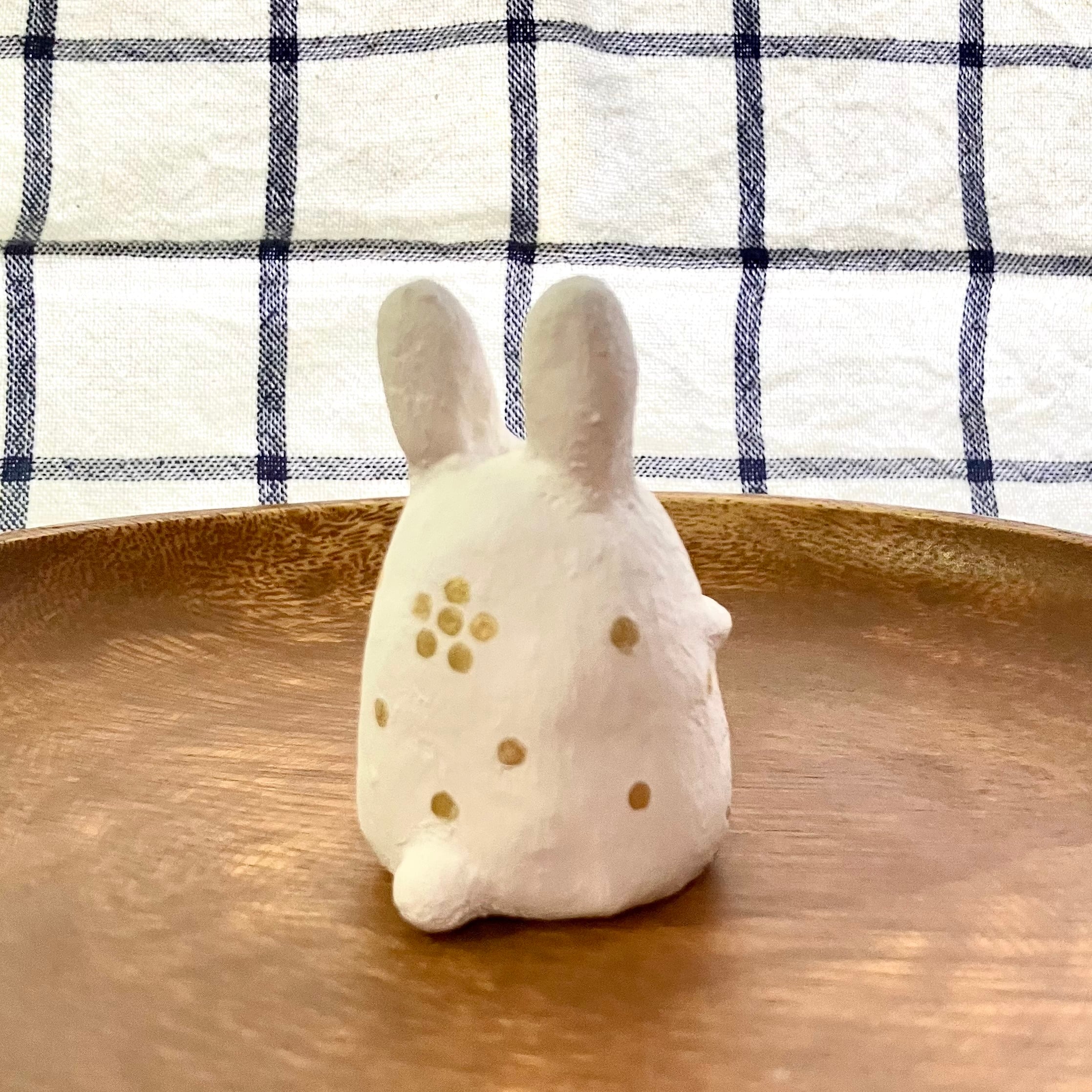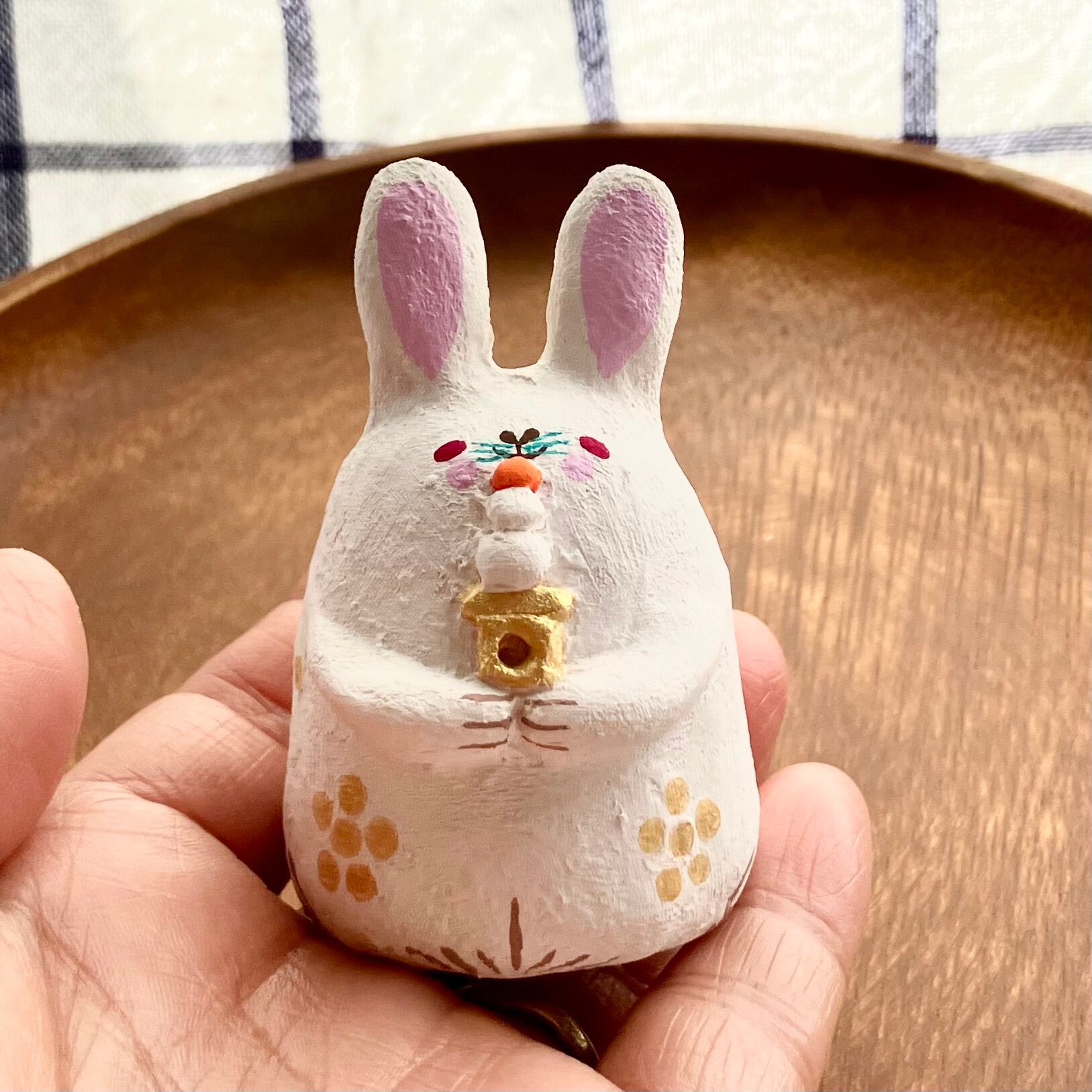 小サイズの干支の卯年の兎さん張り子です。こちらもお客様からのご意見を頂き製作致しましたが、卯年の兎さん張り子は以前も製作販売し、完売しておりました為、再販となりますがデザインは若干変えております。今回は立ち耳のみ製作しました。ゴールドの三宝に鏡餅を乗せた物を持たせてみました。所々にゴールドのドット、梅の花を思わせるドットをあしらって華やかに仕上げています。
