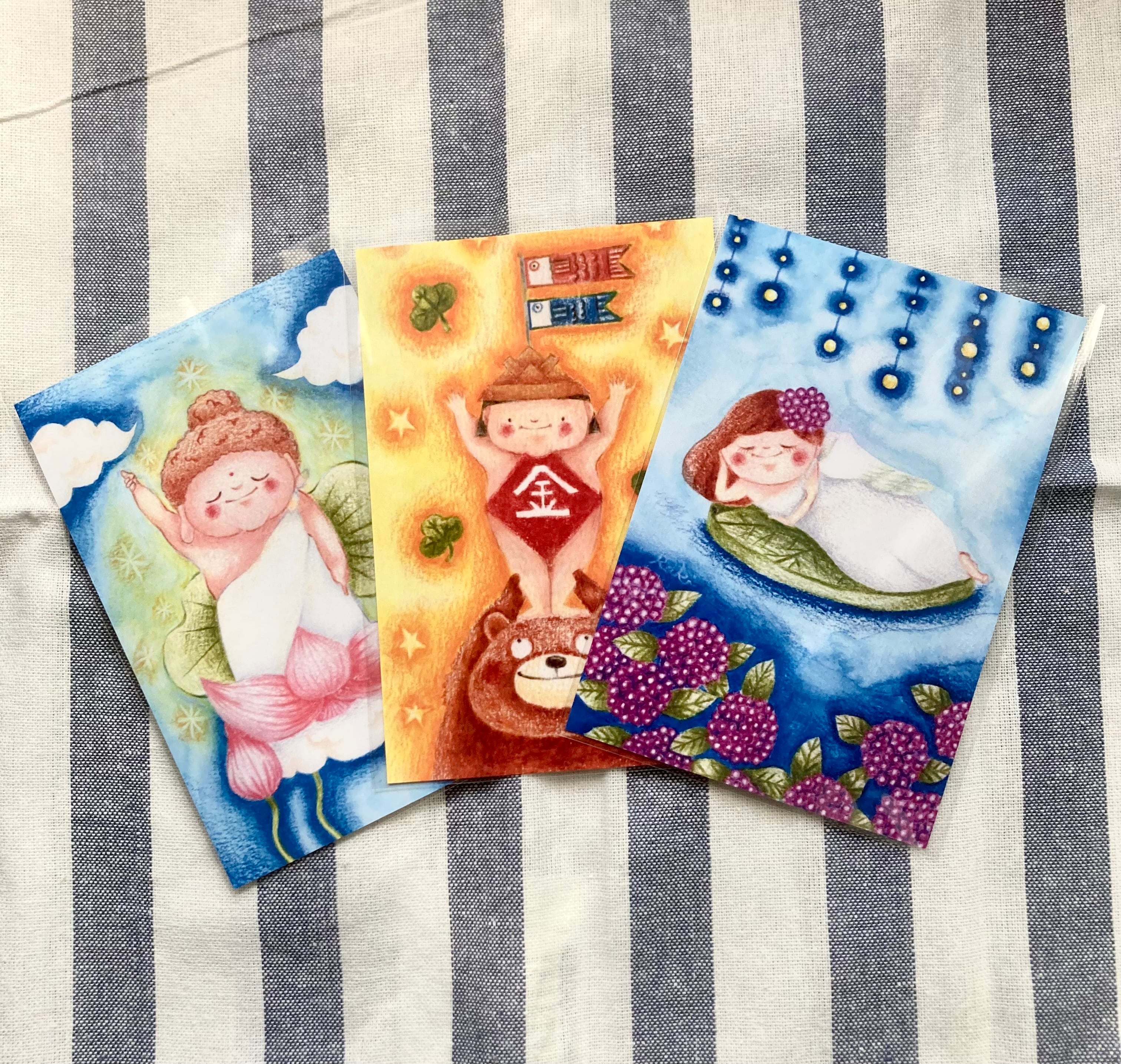 前回描いた春の行事をテーマに描いた2作品を、別バージョンで新たに描き、ポストカードにしました。今回、梅雨をテーマに描いた梅雨の妖精をポストカードにしたものを加えたポストカード3枚セットです。時期ごとにポストカードを変更して、インテリアとしてお飾り頂いても、ポストカードとして送って頂いても。