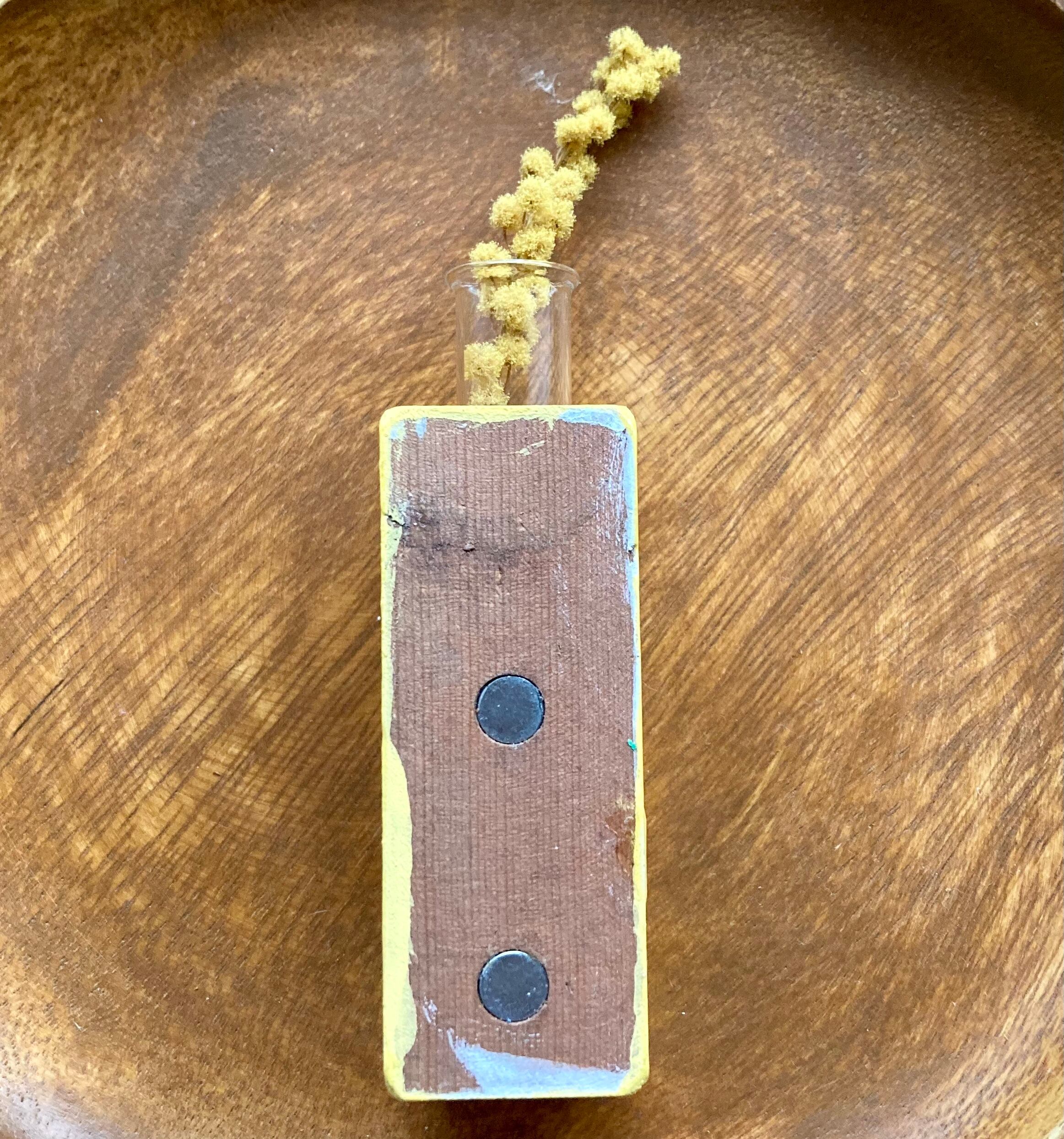 木製のマグネット付き角柱に、小さめの試験管式ガラス花瓶が差し込まれています。