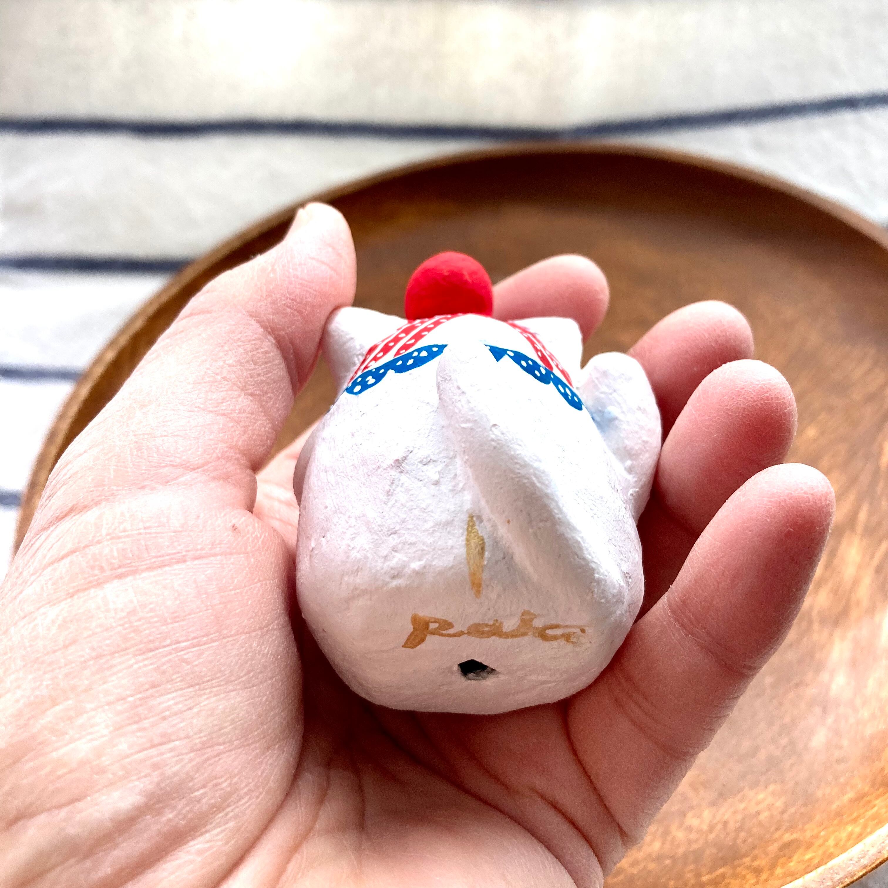 張り子の人形、タコ乗せ右手招き猫ちゃんです。前回製作の招き猫ちゃんからのリニューアルバージョンです。手の平サイズ。