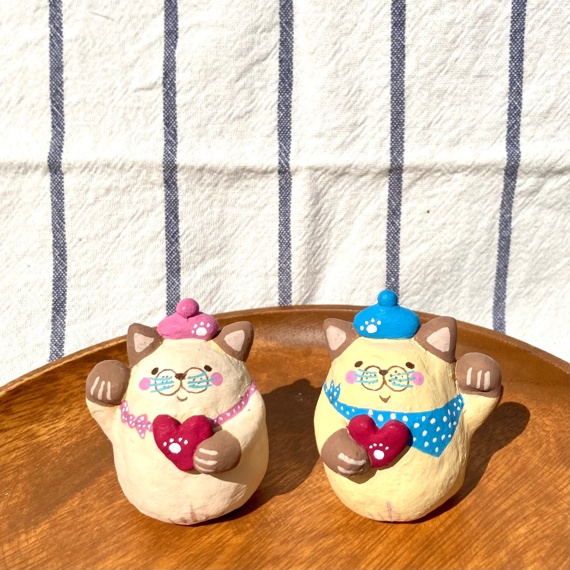 ふんわりピンクのベレーを冠って、ハートを片手におしゃれな招き猫ちゃんです。
