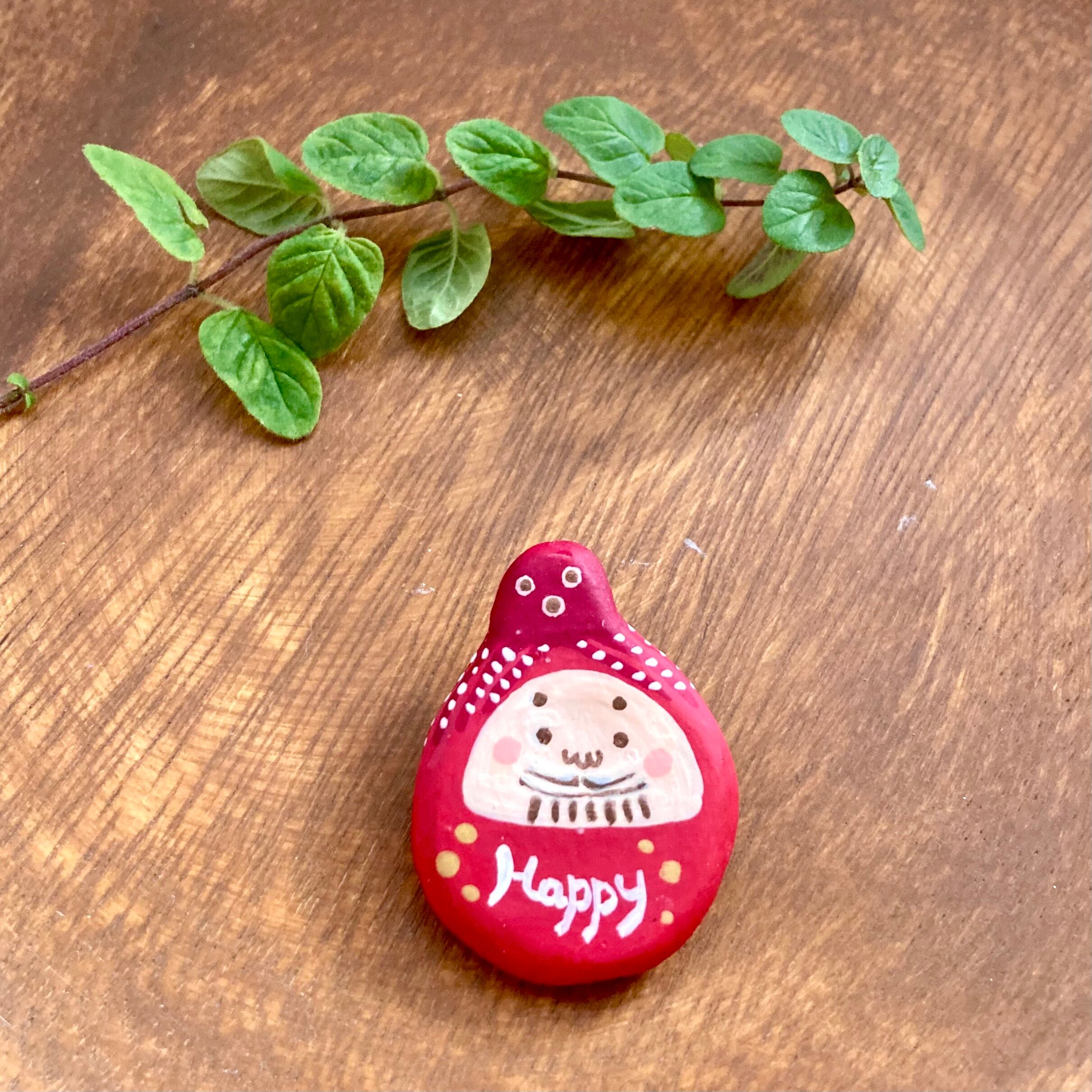 私の作品の中に、縁起物の張り子作品にいる、タコを乗せた招き猫ちゃんや達磨ちゃんがありますが、今回はその達磨ちゃんをブローチにしてみました。