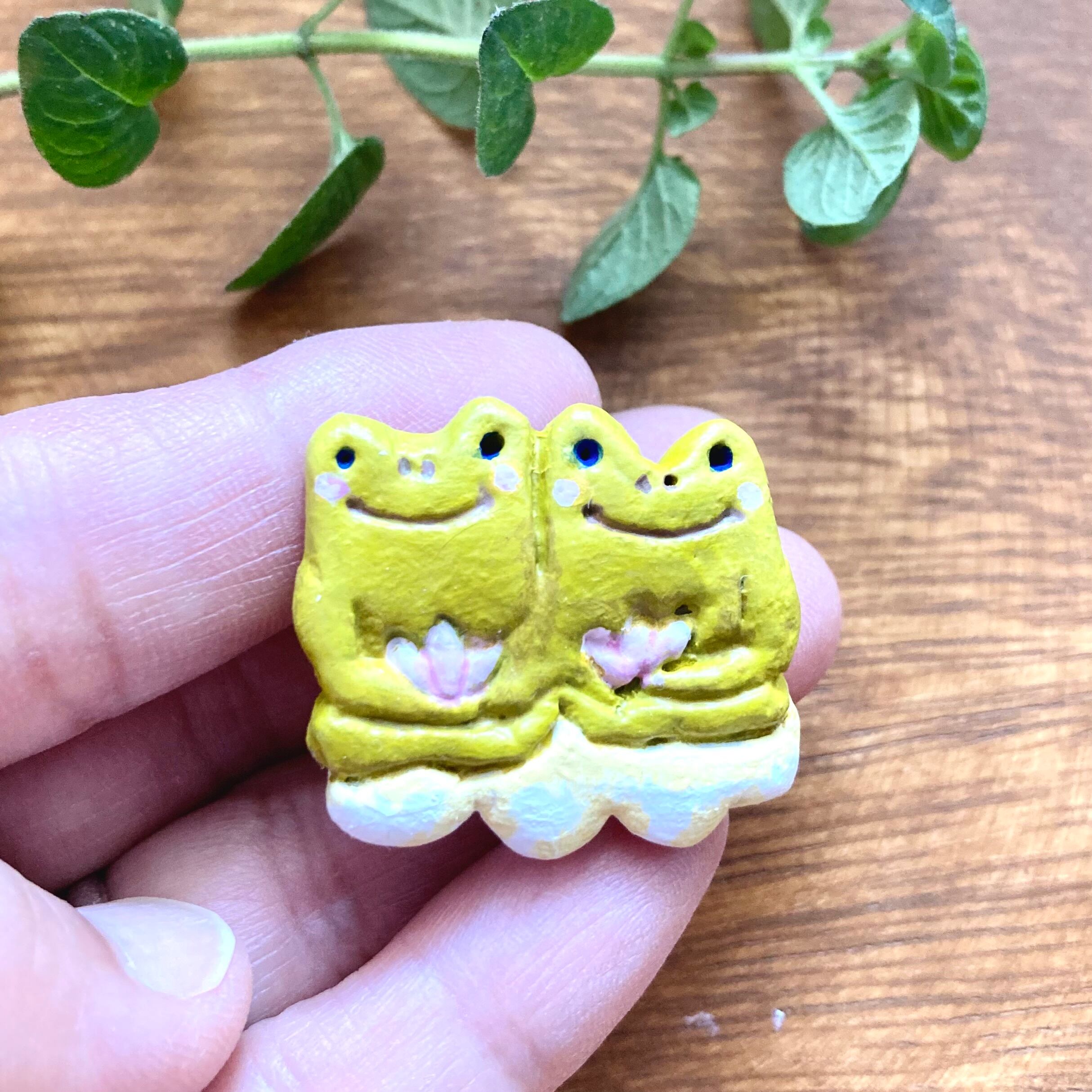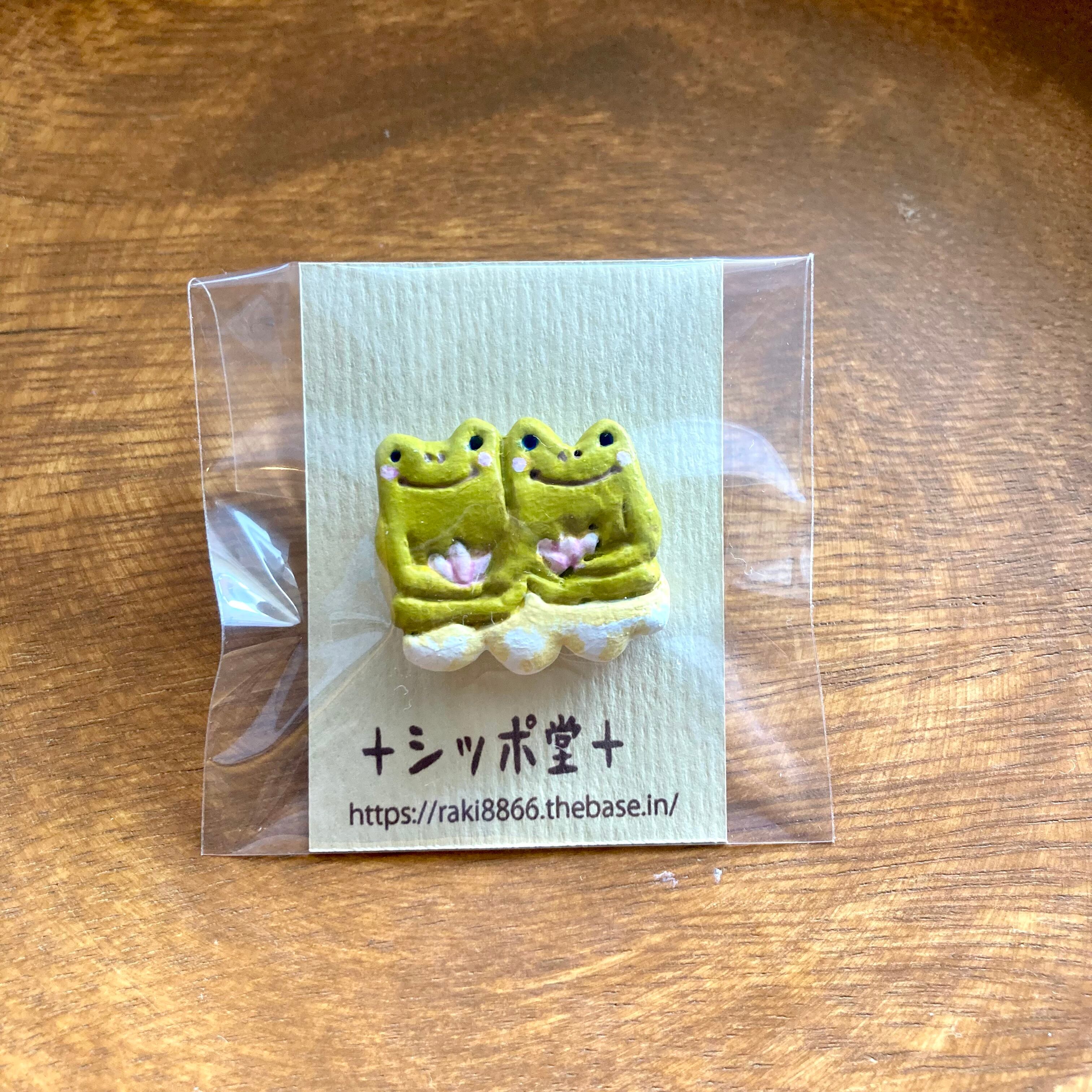 睡蓮を持ったカエル姉妹のピンバッチを作りました。可愛い笑顔で見る人を癒してくれます。
