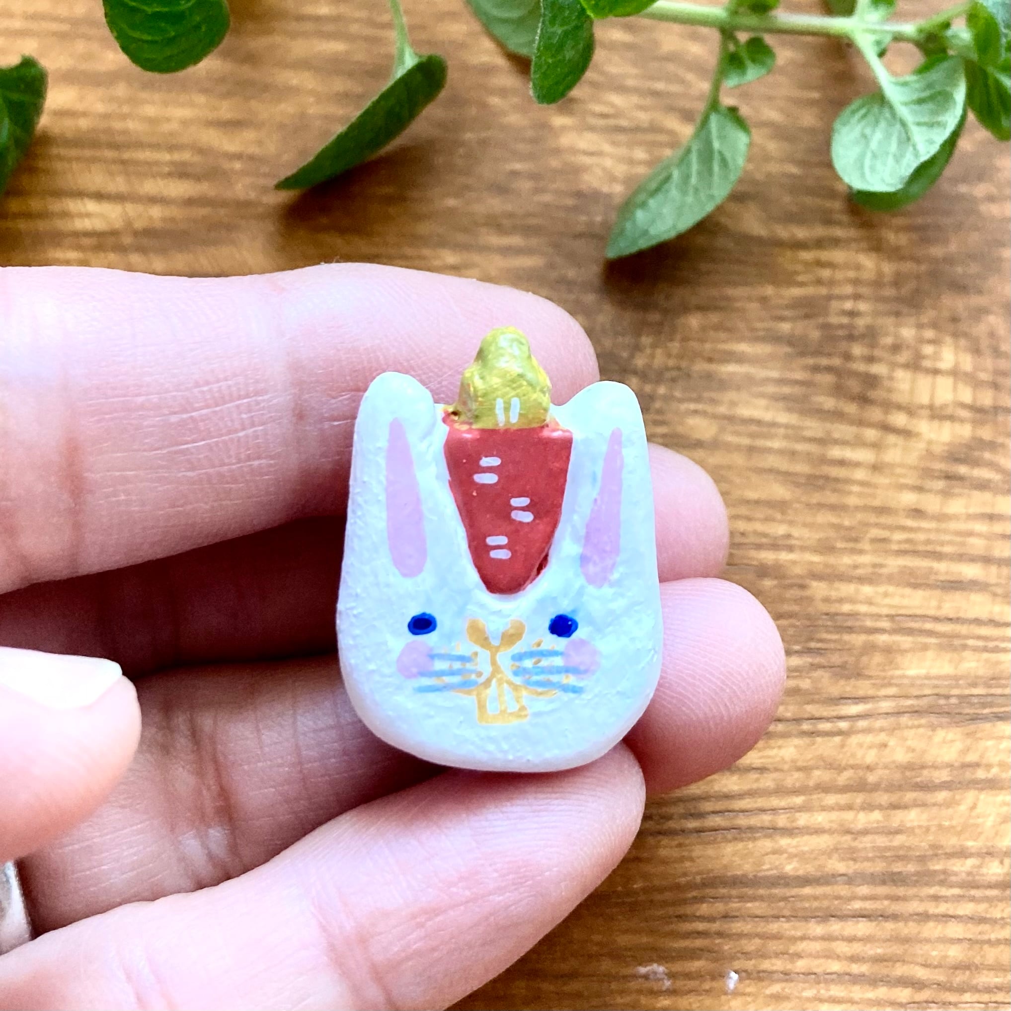 にんじんを両耳に挟んだユニークなウサギさんピンバッチを作ってみました。にんじんを長い耳に上手に挟んだウサギの笑っている表情に、クスッと笑ってしまいます。