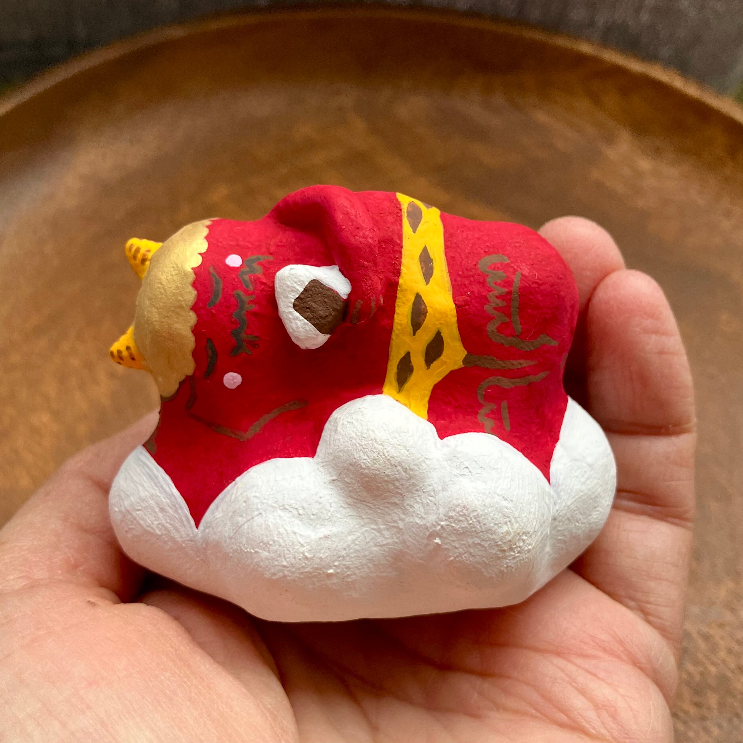 張り子の人形、雲の上でごろ寝リラックス赤鬼くんです。おにぎり持ってうとうとしています。手の平サイズ。