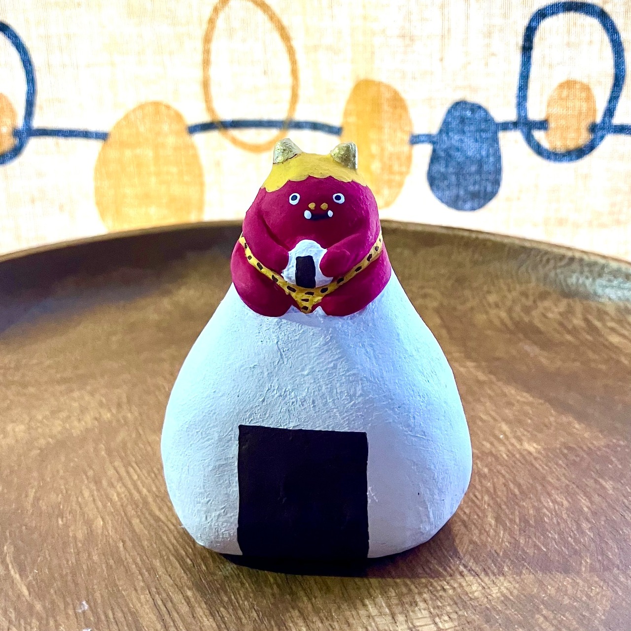 張り子の人形、またまたおにぎり赤鬼くんです。大きなおにぎりの上でおにぎり持って、ランチタイムな小赤鬼くんです。手の平サイズ。