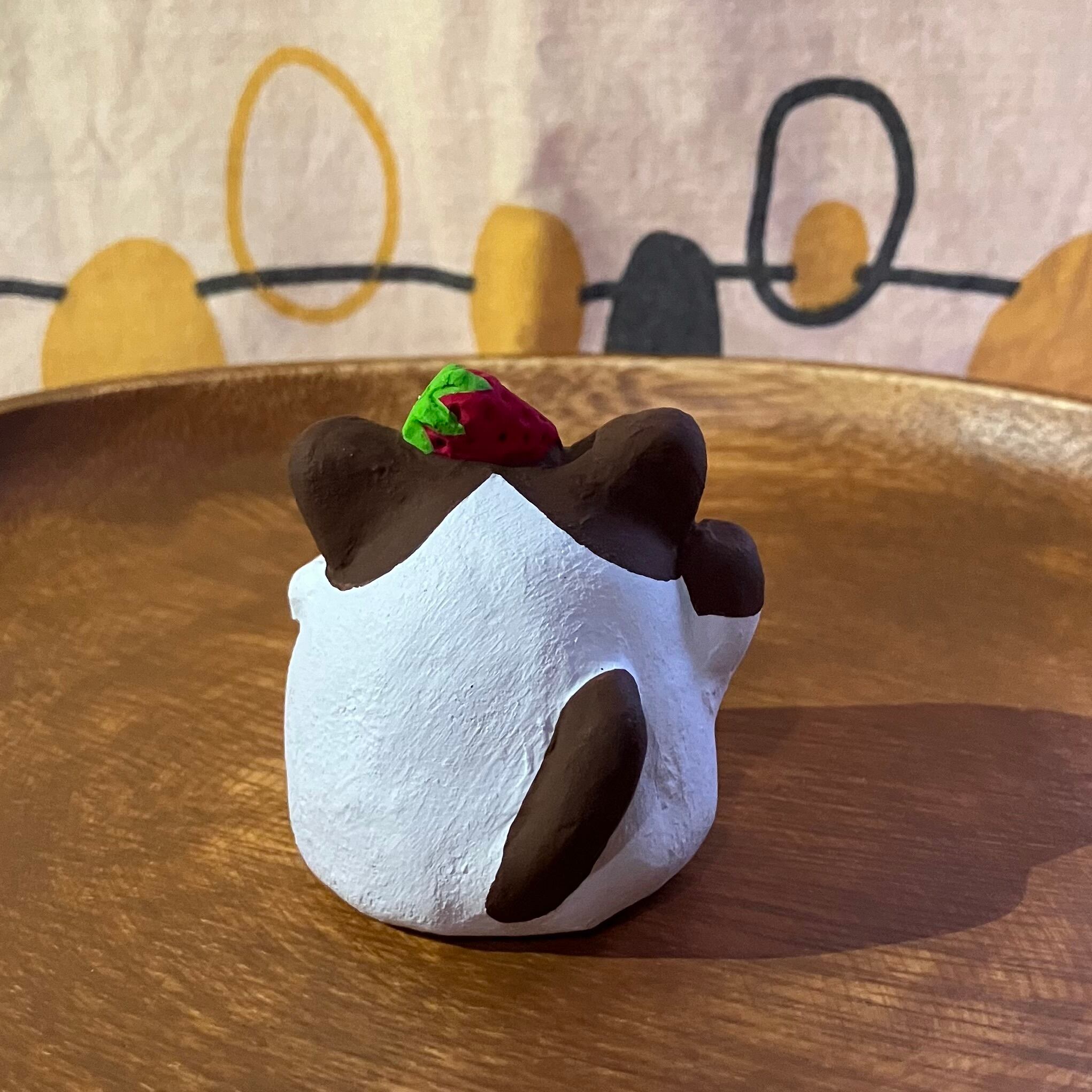 縁起物!張り子人形、苺を乗せて・可愛いくポーズ!右手招き猫ちゃんです^ ^ 手の平で優しく包める、手のひらサイズです。